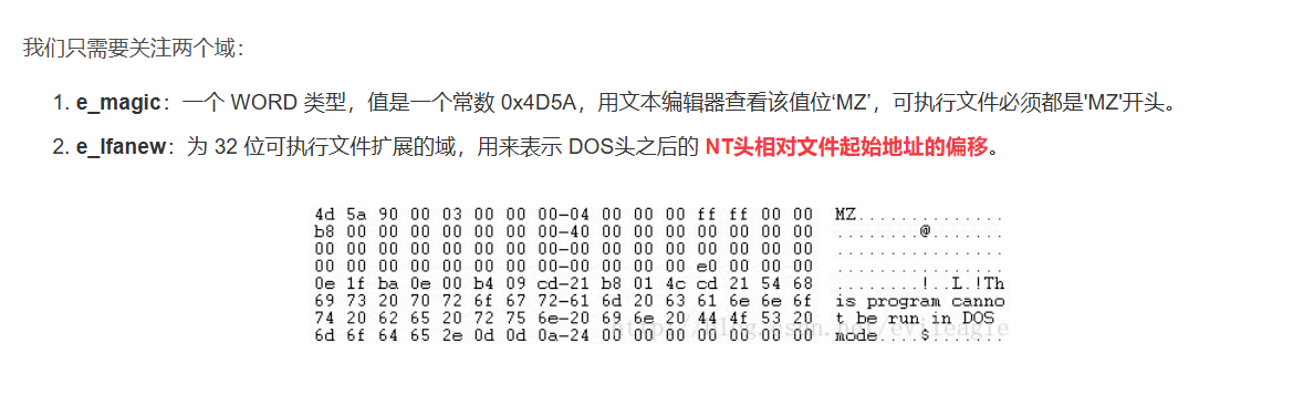 DOS头 的作用是兼容 MS-DOS 操作系统中的可执行文件,对于 32位PE文件来说,DOS 所起的作用就是显示一行文字,提示用户:我需要在32位windows上才可以运行。我认为这是个善意的玩笑,因为他并不像显示的那样不能运行,其实已经运行了,只是在 DOS 上没有干用户希望看到的工作而已,好吧,我承认这不是重点。但是,至少我们看一下这个头是如何定义的: