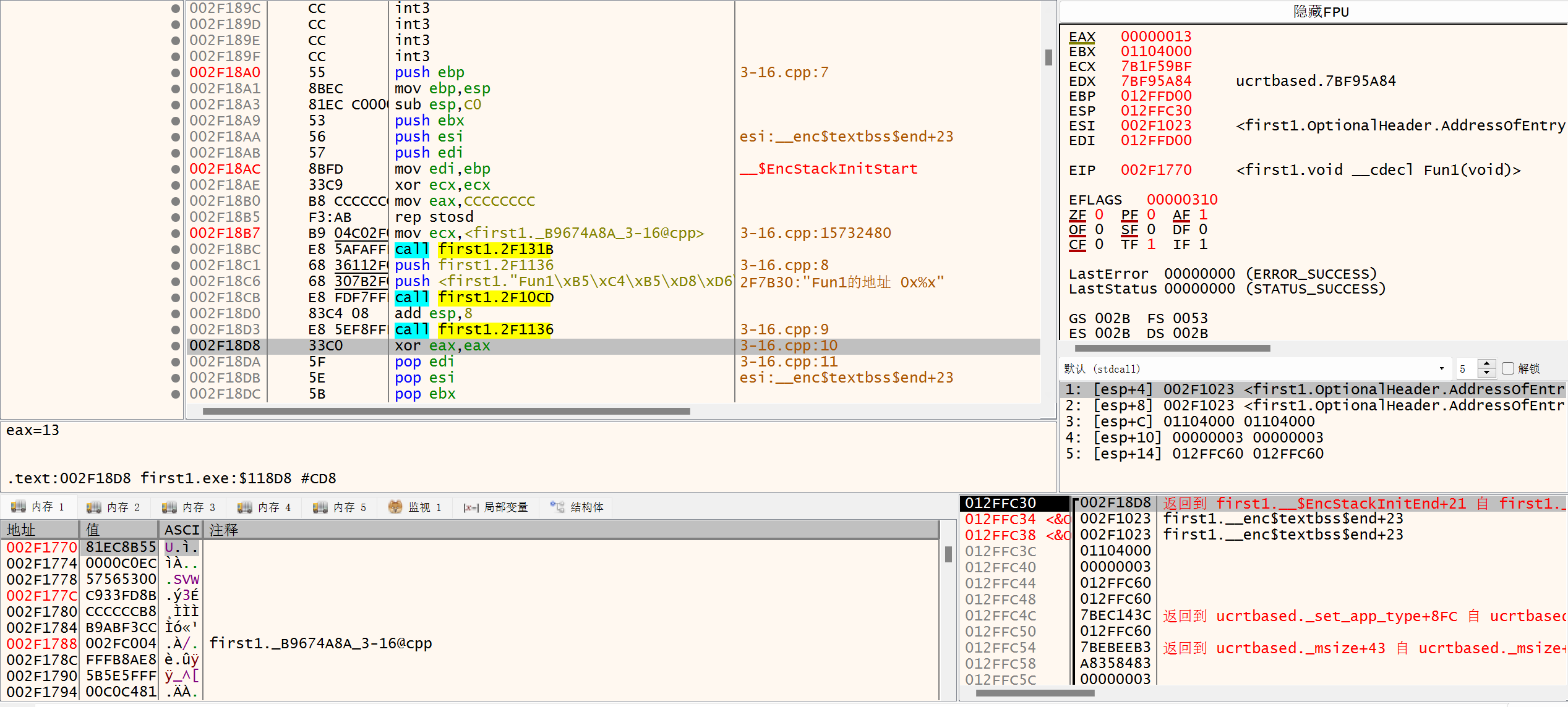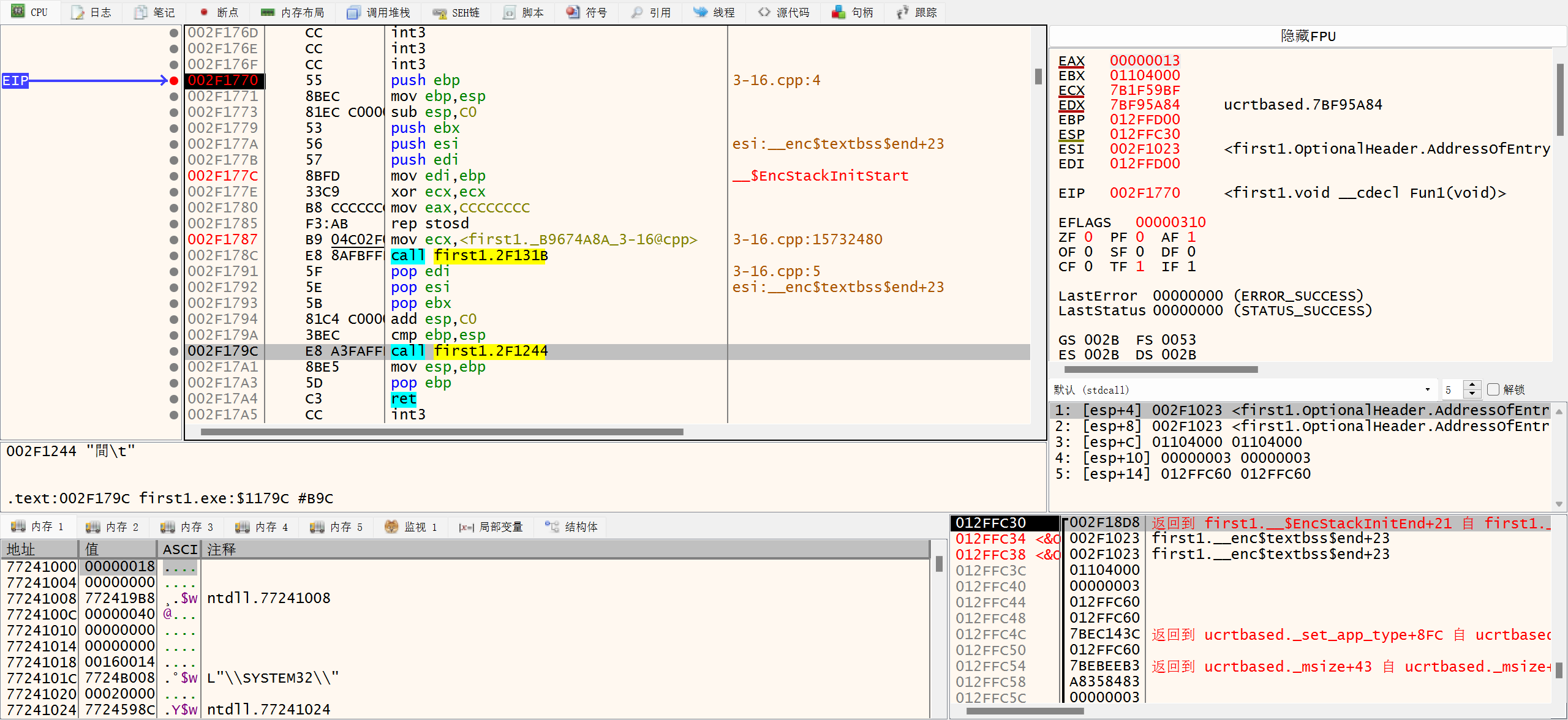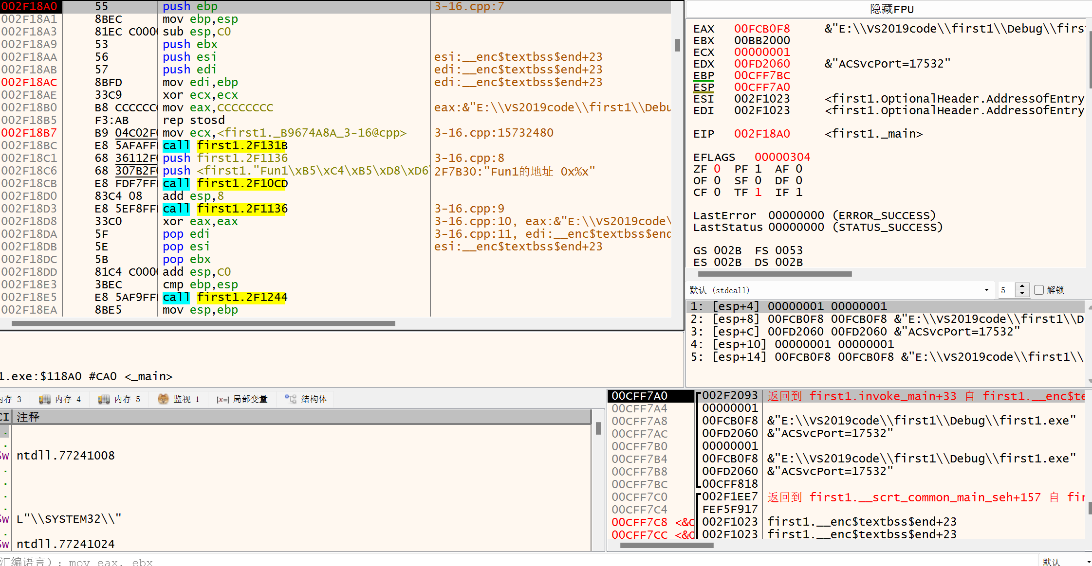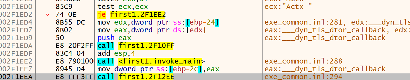 main函数在第4个call 被调用; 继续追 [esp] = 0x002F1EE7(第4个函数是main)