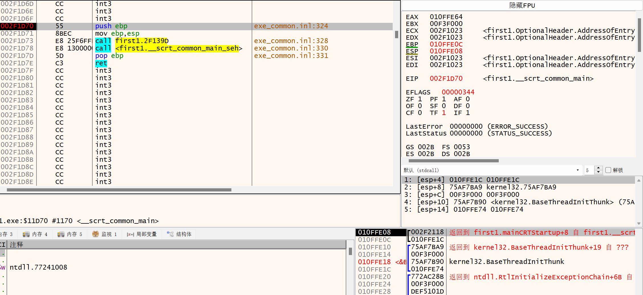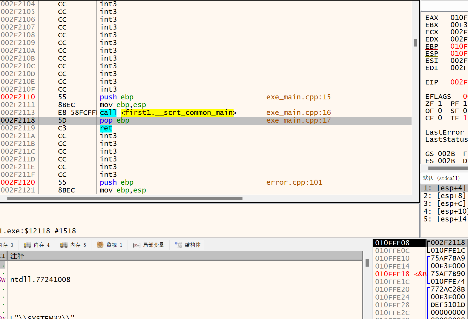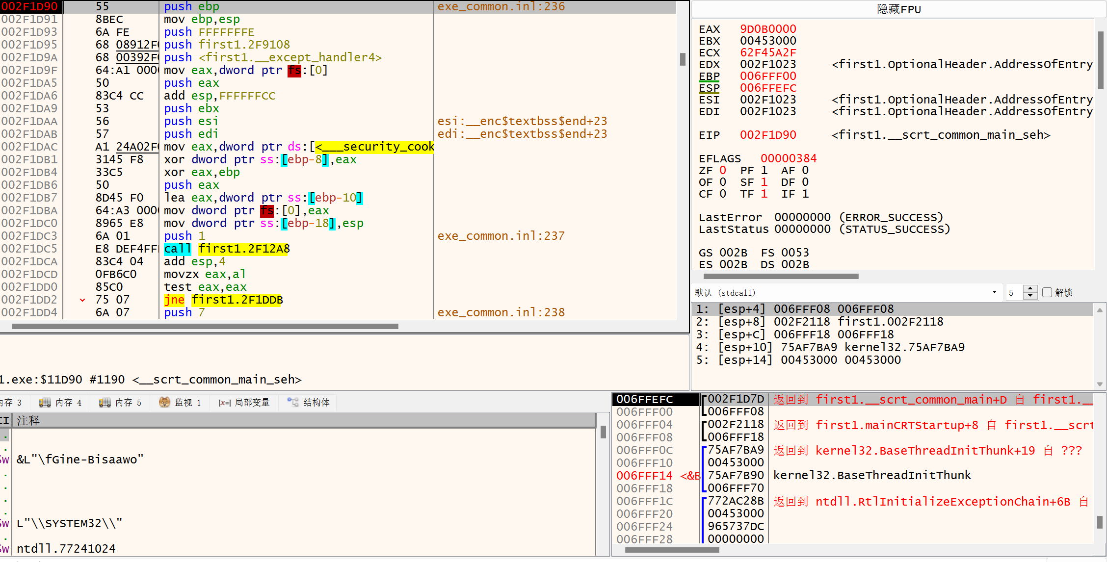 根据[esp] = 0x002F1D7D 反汇编转到 ,(_scrt_common_main_seh函数)