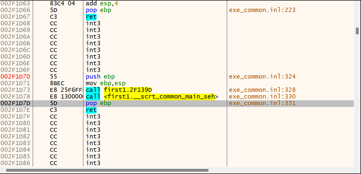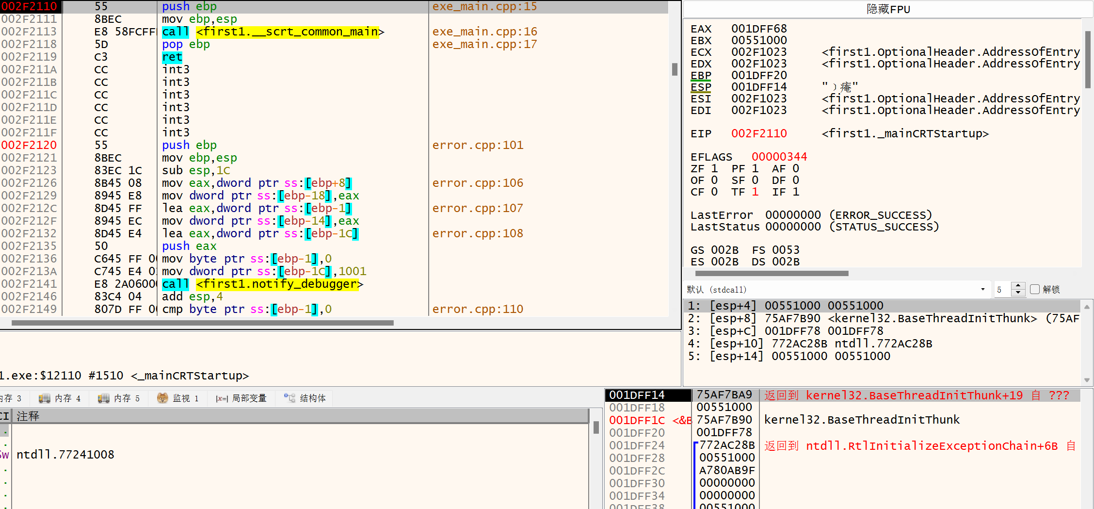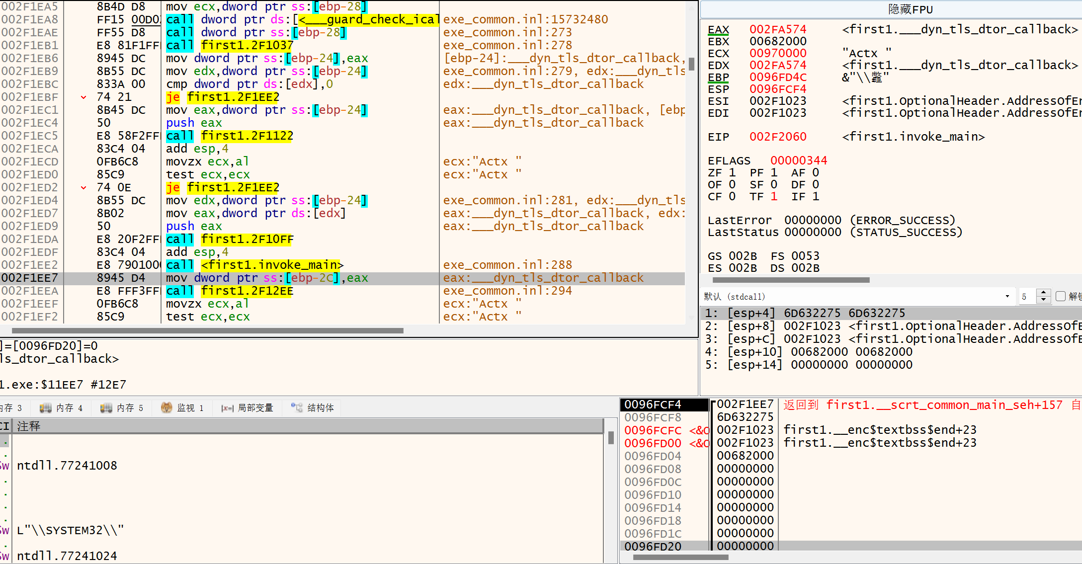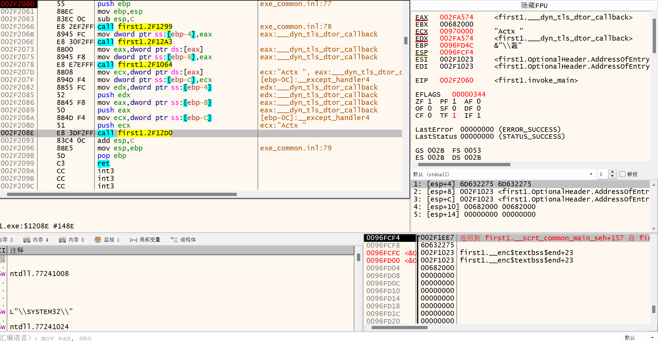 根据[esp] = 0x002F1D7D 反汇编转到 ,(_scrt_common_main_seh函数)