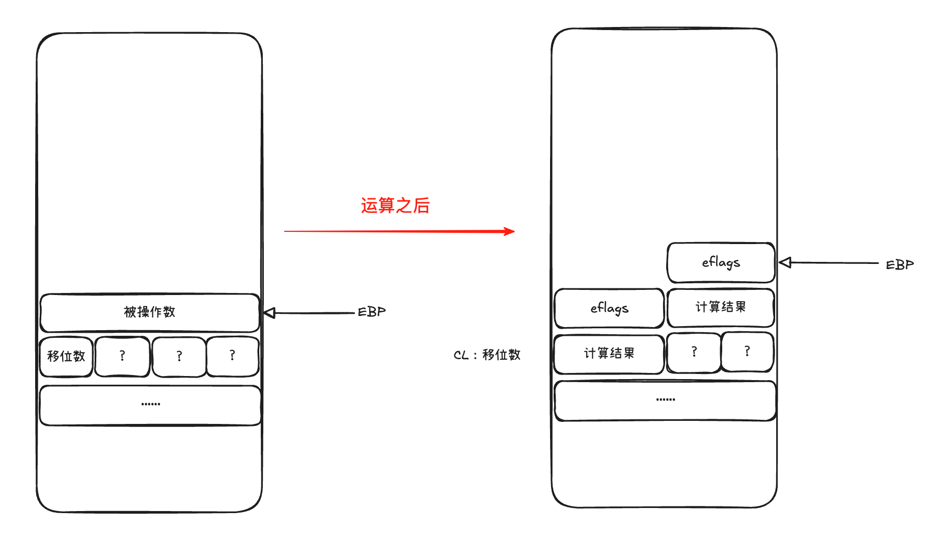这个Handler中,从栈顶读取4个字节的被操作数放到eax寄存器,从栈顶+4的位置读取1个字节的移位计数放到cl寄存器。然后抬高栈顶2个字节,执行移位操作,把移位的结果放到新的栈顶+4的位置。最后和加法一样,移位操作同样会涉及eflags寄存器的修改,也要把最新的eflags保存到栈顶。
