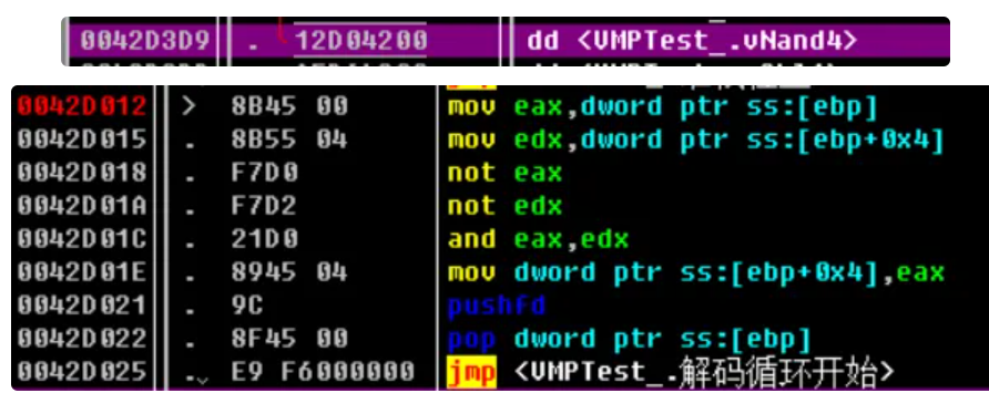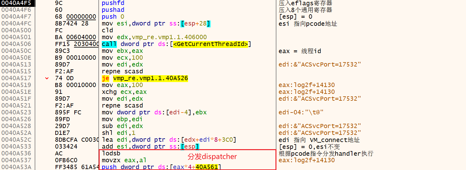 为了达到这种不同指令执行不同handler分支的效果,编码实现层面通常用switch+case实现,用于将不同的指令跳转到不同的分支执行,业界俗称dispatcher。具体到汇编代码,switch+case一般的汇编形式为:mov ecx,dword ptr ds:[eax*4+base](注意寄存器可能会变成其他的,但这 xxx*4+基址的形式不会变) , 这是比较明显的特征,用以用来定位VMP的dispatcher。